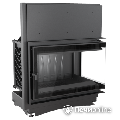 • Распашная угловая чугунная дверца с с Г-образным жаропрочным стеклом поверх узкой рамки;